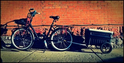(above photo) A nylon gym bag full of wet clothes, and a BikeRev trailer containing slightly more than $50 in groceries.