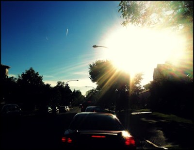 (below photo) I was on my way home this evening from the health club and grocery store and the weather was just perfect…not-too-hot, not-too-cool, brilliant sun, and not a cloud in the sky. After this past week of mostly rain and then humid weather this was truly welcome. I spent my day rushing around a hot kitchen and it felt really good to be out in the fresh air. In the below picture I was waiting at a traffic light. I was facing west and the sun hung low because it was mid-evening. The traffic light seemed especially long. So as I stood there straddling my bike I squinted through the sun and watched two planes travel through the sky (visible in the picture) knowing I will be on one in a couple weeks. The warmth of the sun was on my face and a slight breeze was to my back. I also thought, as I waited for the light to change, that I haven’t had a car in nearly two months and I’ve barely noticed it. At that moment there was nowhere else I wanted to be.
