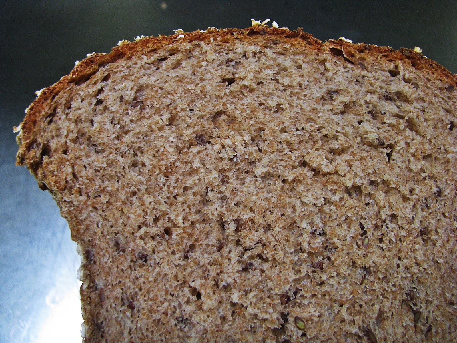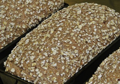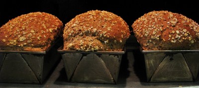 A nylon bag containing a computer, a canvas bag containing an extra camera, an electronic reader, two books, a journal, a small tripod, and various writing tools; a dough rising bucket containing a small paper bag which contains a smaller plastic tub of homemade gravy; a round tin resting atop the dough rising bucket containing 4 chive crepes stuffed with beef stroganoff; two loaves of freshly baked oatmeal-flax bread.