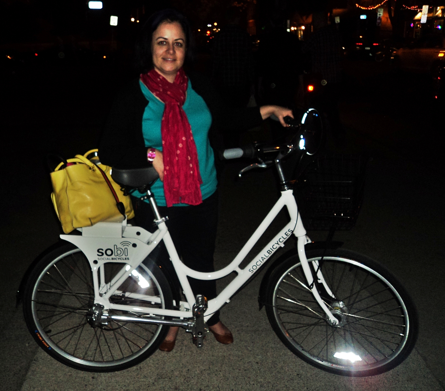 Most who visit this blog know that I like bikes…a lot. I ride mainly for transportation, but also because I enjoy it. And some also know that I am not entirely car-free, but car-lite (I own one small late model pick up truck and a small fleet of bikes). Sometimes it seems silly that I still own the truck seeing I can get by without it, and given the true cost of car ownership. Today, for example, I took the truck to my mechanic for it’s annual inspection…it turns out I need to have hundreds of dollars of work done prior to inspection (surprise!). Anyhow, feeling somewhat down (disgruntled even) about the continual money pit of owning a car, I took my two dogs for a walk this evening and was contemplating what it would be like–and if I truly would be able–to be entirely car-free; as I walked I thought about selling the truck. And as I walked and my dogs stopped to pee on whatever vertical thing they could find, the above woman happened to pass me. As she passed I noticed her somewhat unique bike (it’s shaft driven; no chain) and asked her about it. It turns out Tanya was here in town from Vancouver to attend the Complete Streets Summit today and is helping to start up a SoBi bike share program. Excellent! She was also nice enough to agree to have her picture taken (thanks Tanya!). So…was this fate, that I’m walking around considering going car-free and I run into someone helping to do a bike share start up? Maybe, maybe not…then again maybe I’m just over-analyzing (which I tend to do). Whether I sell the truck or not it’s exciting news to have a bike share coming to Buffalo.