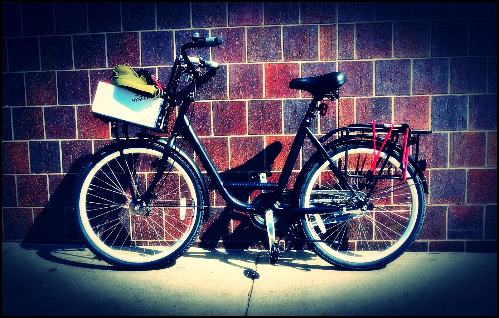 A few comments on the new bike…Well, I’ve had it nearly a week and am finally getting used to it. I haven’t introduced a new bike into the fleet in some years and it sort of feels like I brought a new pet in the house…not sure what to expect as every bike is different. Overall I really like it. I really love how smoothly it shifts (and that I can shift when I’m stopped…because of the internal shifter) but I can see how a 3-speed can be limiting. I’m still getting used to the coaster brake (haven’t had one of those since being a kid) but can see how useful it can be…it’s nice to coast to a stop slowly with my feet. I’m also still getting used to the front rack…in that it turns when the handlebars and front tire turns…my others don’t and it seems a bit more stable if the rack stays stationary. I’m enjoying it’s size (it still feels so small to me) and that it is easy to navigate in and out of places. It’s sort of exactly what I was expecting…a nice simple bike that can handle a certain amount of load carrying and will be good for day-to-day travel. In short, I love its simplicity. It is a welcome addition to my bikes but will definitely not replace the Mundo (which is far superior not only in it’s load carrying, but is still the most comfortable bike I’ve ever ridden). One interesting thing I discovered tonight (about the Cargo-T) is that the spacing of the bars on the front rack is perfect for carrying 1.5 liter bottles of wine…and that may be a bit detrimental.