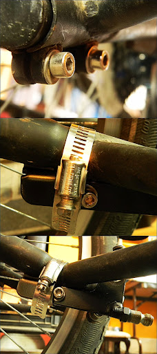 Pictured below is how I attached it to the frame using an existing bolt. On the Mundo there are two bolts on each side of the frame holding the rear drop-down bars in place (pictured in the first of the photos below). I’ve eyed these bolts for months while holding the hitch up to them in various positions trying to figure out how it would work. BicycleR Evolution trailers offer two hitch options; I have c-hitches on two other bikes, but on the Mundo I used the standard hitch. Anyhow, the hitch is meant to attach to the axle but also has two smaller holes, one of which fit perfectly in place of one of the bolts on the frame of the Mundo. After tightening it, it felt snug but I didn’t feel comfortable with it being held with just the single bolt (which is much smaller than the intended axle rod attachment) so I also used a hose clamp for added security.