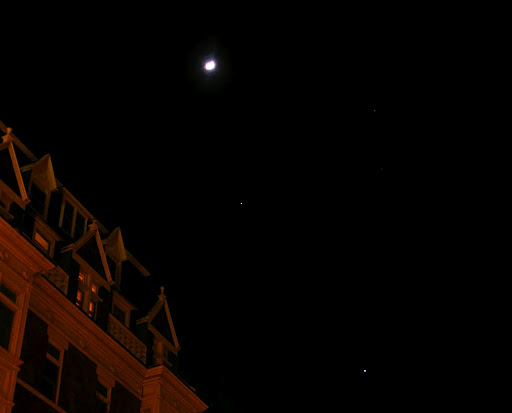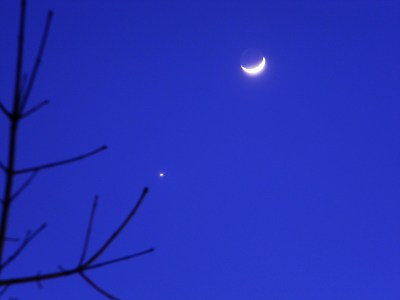Well this is interesting. The above photo is a zoomed in version of one I posted yesterday (scroll down one post). It was one of a few photos I took at dusk, and in the post I referred to it as the moon with a star visible. A reader of this blog commented that it wasn’t a star but the planet Venus (thanks Lauren!)…she also sent me this interesting link. The below photo I took this evening, and if I am reading it correctly, it is the Moon, Venus, and Jupiter…pretty cool. The top photo was taken at dusk whereas the bottom one at night, hence the different locations of the planets. It’s also interesting in that when I took the bottom photo tonight I snapped a half-dozen or so over the course of ten minutes. And while I took the photos I kept the camera stationary and in the exact same position…I just changed the light settings. And after uploading them and looking at the photos in succession I can see the planets move just within the ten minute time span…it’s easy to forget (or difficult to imagine) that the rock we stand on as I type these words is spinning and hurtling through space. Anyhow, if you want to learn more about these planets, their alignment, and their visibility, here’s a couple links with pictures, diagrams, and text (here and here). You can also see a few additional photos that Lauren took and posted on her blog, It’s Knot You. Lastly, here’s some brief text from the articles that are linked.