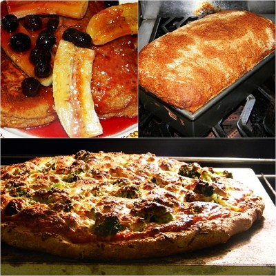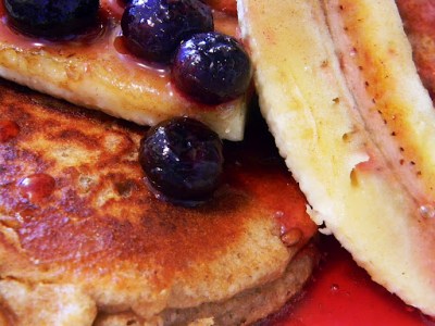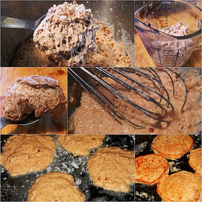 I’ve mentioned before that on Saturday mornings I often make my son French Toast for breakfast (click here for multiple recipes and photos) but today I made a variation…whole grain pancakes. And why I call this a 3-in-1 recipe is because of just that…I made three things out of one recipe. I often make and post recipes for bread on this blog where I use the same dough for a loaf of bread and pizza (click here for many recipes and photos) but today I also took a bit of the pre-ferment and autolyse (soaking flour) and made pancakes. Yum! Firstly, let me just say that pancakes are not my favorite food…not sure why, just don’t really care for them. But these were so delicious–if I do say so myself–that I ate half of them as they were coming out of the pan, sans syrup. I also topped them with fresh blueberries, caramelized banana, and pineapple syrup (click here for recipes one how to do this). This is an easy way to make pancakes using any of the whole wheat recipes you find on this blog…the next time I make Ezekiel Bread I’ll use some of it for these. Anyhow, the recipe for the bread dough and pancakes are below.