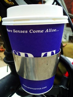 A gym bag full of wet clothes. A canvas bag containing–among other things–two books, a magazine, an extra camera, and a few pens and pencils. Eight small wine glasses, two Indian meal moth traps, and a red reflector on a 4ft/1.2m stick (for the front yard, not the bike). And also a full cup of hot coffee in the handlebar cup holder.