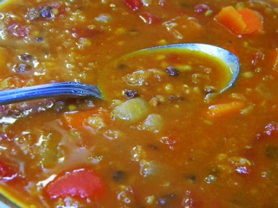 I really enjoy lentils….and I’m grateful that I do. Because not only are they super-healthy for you, they are also a great medium for all sorts of flavors and textures…and not just vegetarian recipes. Anyhow, a purveyor at work gave me a couple pounds of these lentils as a sample (pictured above)…beautiful aren’t they? I made the below soup recipe for staff lunch today…it was so good (if I do say so myself) I had a double serving. It’s also really easy to make. And while I used the above multi-colored lentils, any lentil will do…some just take longer to cook than others. The spices I used (pictured below and also listed in the recipe) are also interchangeable…add or subtract whatever suits your personal taste. And listed at the bottom of this post are a few links of other easy and delicious lentil recipes.