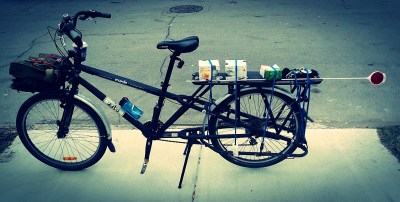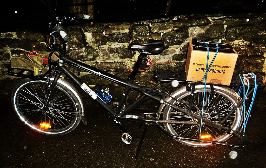 A canvas bag (on the front rack) containing–among other things–a spare camera, a book, and a few recipes. A cardboard box (on the rear rack) containing 5lbs/2.2kg of whole wheat flour, 2 pints of spiced lentil soup, and two roast chicken dinners.
