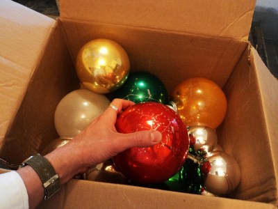 Front Rack: A canvas bag containing a few books and writing implements; a cardboard box containing a dozen or so over-sized glass Christmas tree ornaments wrapped in paper.