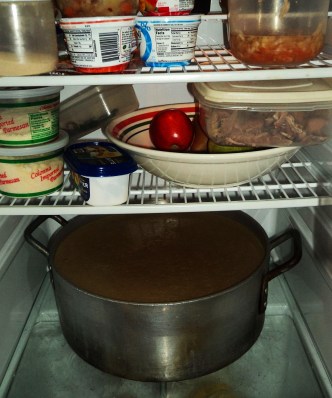 Well, if you are an American reading this blog, or an expat living abroad, you likely celebrated Thanksgiving dinner yesterday with a traditional turkey dinner. I personally love this holiday–it’s not so gift-centered and commercialized as Christmas has become–it’s more about getting together with family, being thankful, and eating a really good meal. Unfortunately the day after has become known as “Black Friday,” but with me–while all the lunatics are out at pre-dawn trying to save a few dollars–I usually lounge around the house while turkey broth simmers on the stove from yesterdays carcass…the left-overs, to me, are as good as the meal proper, and making broth from the carcasses is yet another perk. I’ll make a large batch of it, strain it, then cool it (that’s it below occupying the an entire bottom half of my apartment-sized fridge), and then package it in increments of quarts and pints. Afterwards, I’ll freeze it and have super-delicious broth for the next couple months (it’s great not only for soup, but is especially suited for rice dishes). And while broth is about as simple as it gets when it comes to cooking, there are a few rules to follow. There’s a simple recipe below, but if you’d like a more in-depth look at it, with additional recipes, click this link: Broth, Bouillon, Brodo.