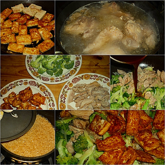 This is one of my favorite stirfrys…traditionally it is made sans chicken–with just the broccoli and bean curd–but my son likes meat so I added it to the recipe; I like it this way, too. This is easy and nutritious; it’s a recipe–or variations of it–that I make somewhat frequently and have posted it a couple times prior (click here and here for more photos and directions)…and when I’m feeling lazy I order it as take out (click here). It made it tonight for dinner and served it over brown rice. The difference in the recipe below is that I first poached boneless chicken thighs in broth, then used the broth in the recipe and to cook the rice. Anyhow, it’s simple to make and as delicious as it looks.