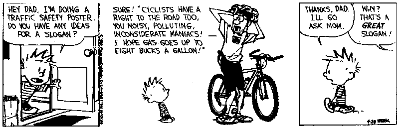 First off, I don’t necessarily agree with everything the dad in this cartoon says–at least not to the extreme–because I still own a gas-powered vehicle, but I don’t use it that often. Tonight was the first time I used my truck in more than two weeks (emergency school supply run for my teenage son). I thought we could just zip to the store and be back in time to prepare dinner (about 5 miles / 8km each way). What a mistake. We went during rush hour and traffic was heavy to begin with but then we got stuck in a stand-still because of road work. My blood pressure immediately sky rocketed; I was not a happy camper…it’s amazing how miserable that makes a person (it does to me) feel. All I kept thinking was I wished I were on a bike. Anyhow, and at the very least, I thought this cartoon was funny.