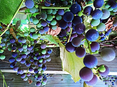 A cardboard box containing just-picked concord grapes, and a paper bag containing two modems and an ethernet cable.
